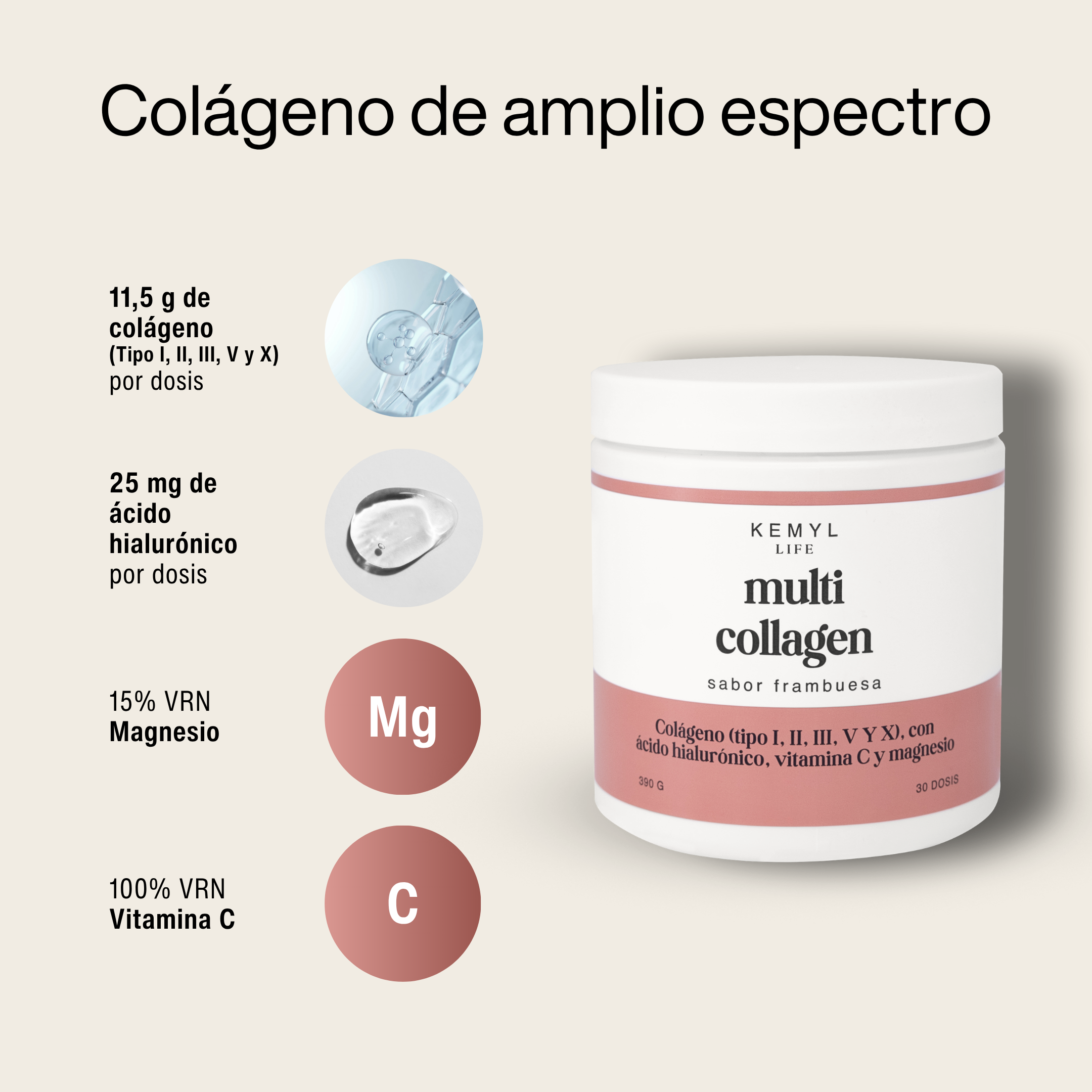Multi Collagen complex (88 %) [colágeno hidrolizado bovino (Colpropur D®), colágeno hidrolizado de pescado (Naticol®), colágeno nativo membrana de huevo (ESM®), colágeno nativo de esternón de pollo (Collavant® n2)], aroma, sales magnésicas de ácido cítrico, acidulante (ácido cítrico), emulgente (lecitina de girasol), ácido L-ascórbico (vitamina C), hialuronato sódico, edulcorantes (sucralosa, acesulfamo K+), colorante (carmín).