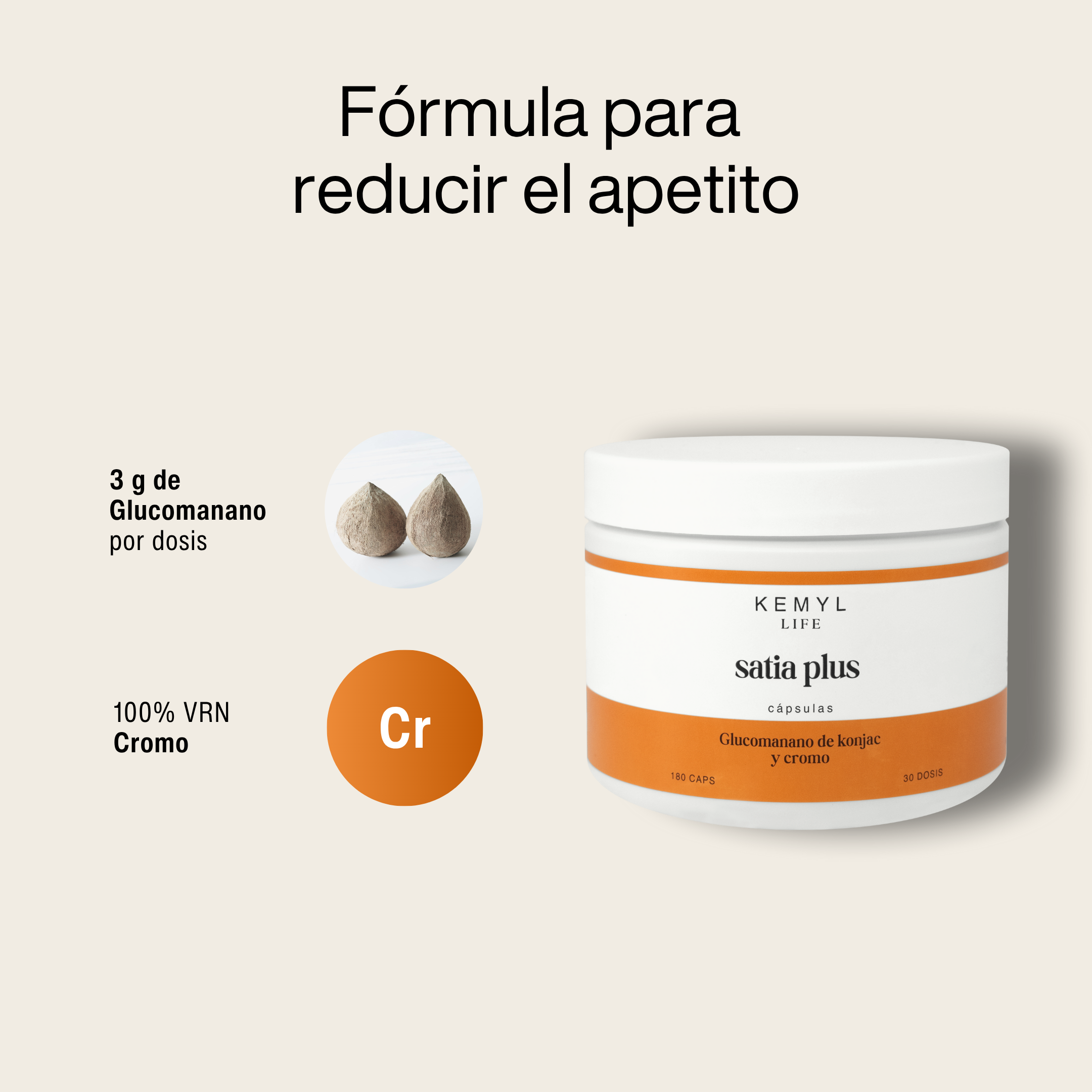 Fórmula saciante que ayuda a reducir el apetito y a controlar los niveles de glucosa, con glucomanano de Konjac y cromo. Ideal como apoyo en dietas de pérdida de peso y control metabólico.